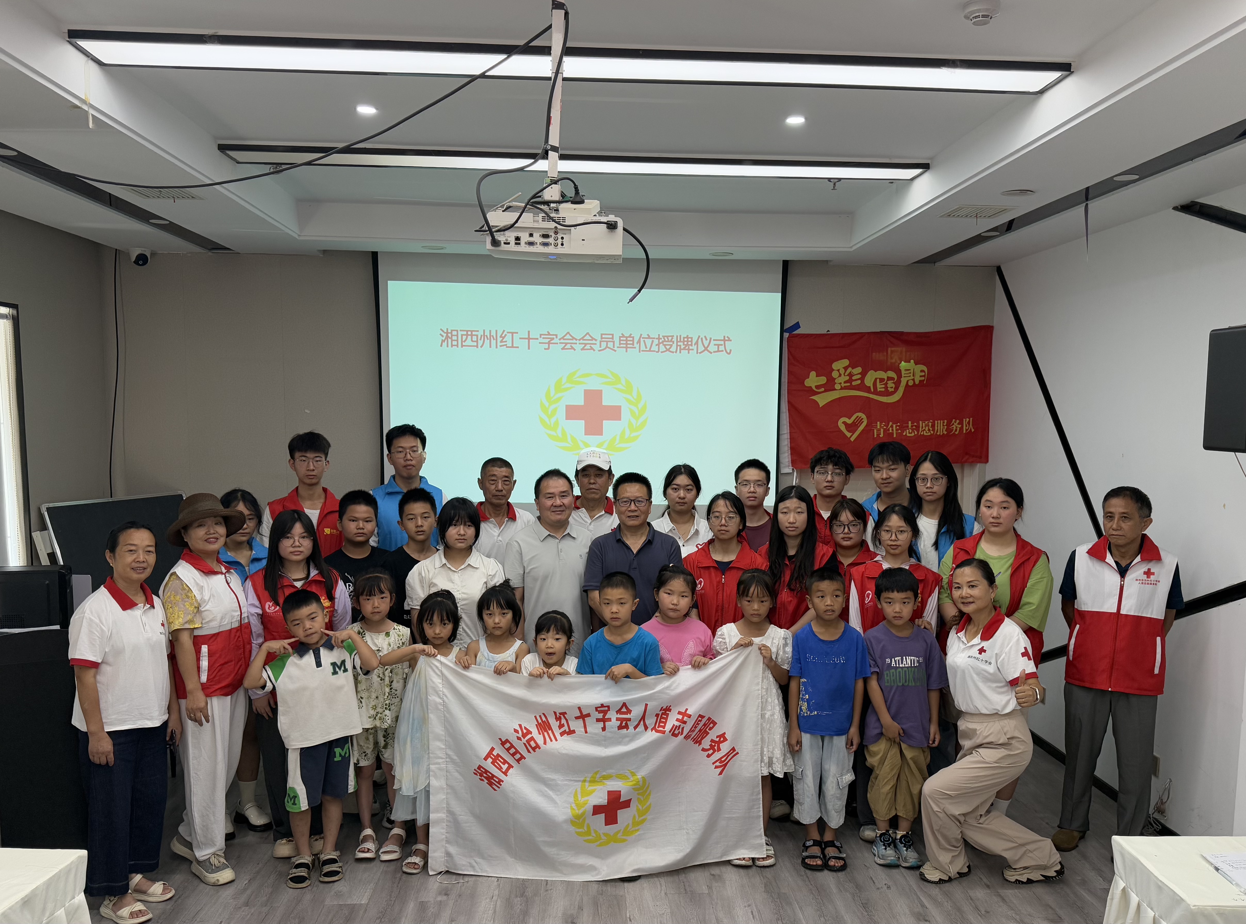 (图为社会实践团与湘西州红十字会人道志愿服务队与小朋友合影)