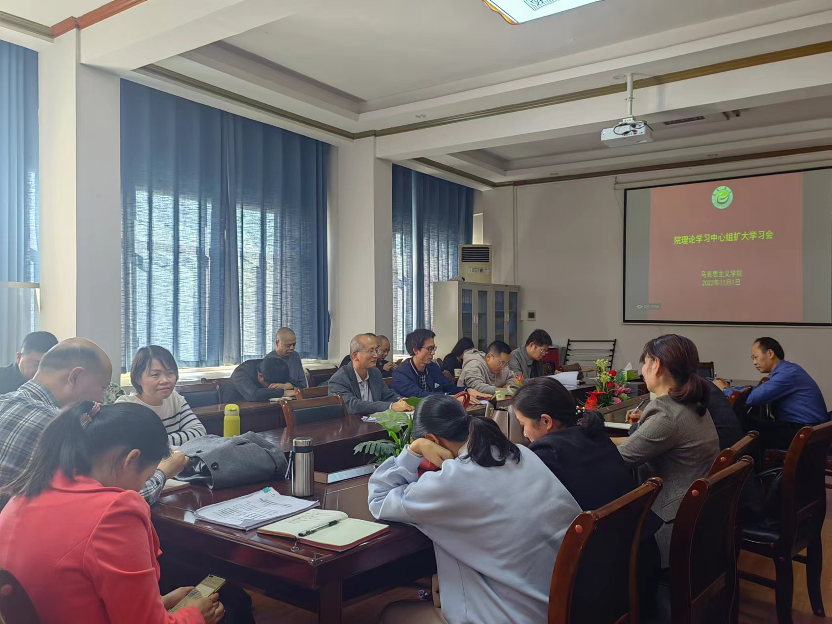 11月1日下午,公司党委理论学习中心组在院会议室召开扩大学习会议,公司党政班子成员柴绪亮、肖映胜、叶伏秋、曾文及吉首校区全体教职工参加会议。本次院中心组学习,集中围绕“学习党的二十大精神,促进学院高质量发展”这一专题进行。