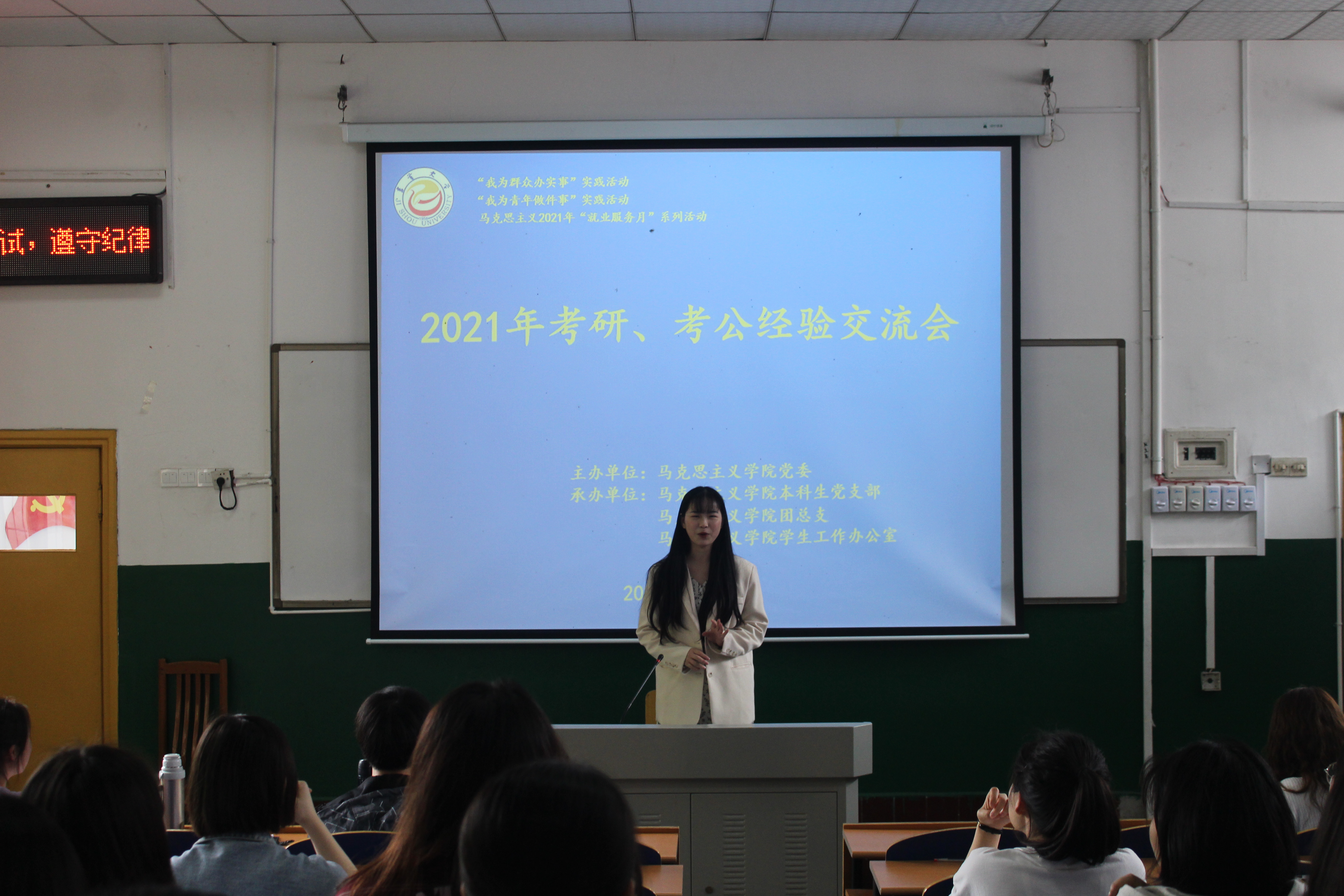 随后,2021届毕业生代表结合自身经历,给予在场同学实用有效的考研、考公建议。刘雯同学回顾自身每一门科目的备考过程,以幽默诙谐的方式向同学们介绍了备考的宝贵经验。宋姣洋同学开门见山,就“考研与实习如何平衡”问题展开了详细论述,为在这方面有顾虑的同学打下一针“定心剂”。吴彩虹、唐登霞和肖诗晓同学则深入分析当下考研形势,向参会同学们分享了笔试和面试中实用有效的资料与技巧,让在场同学收获了满满的“干货”。周唐慧同学就考公务员的基本流程,考公务员如何准备以及如何调整心态进行分享,让同学们对考公务员有了较全面的了解。
